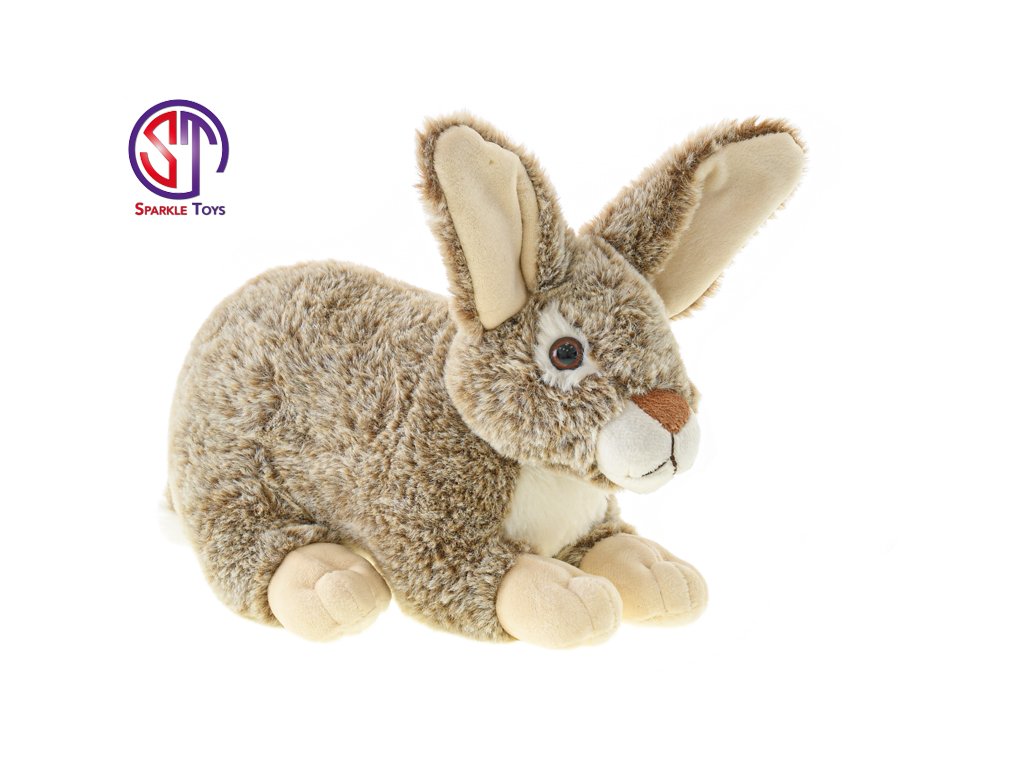 Měří 28 cm, má velké dlouhé uši a celý je zbarvený do hnědé barvy.