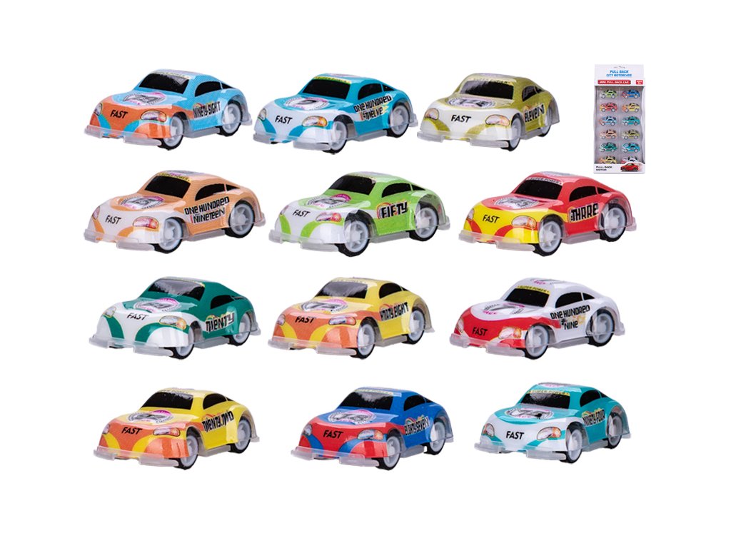 Auto závodní 5,5 cm zpětný chod 12 ks v krabičce.