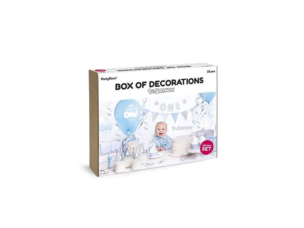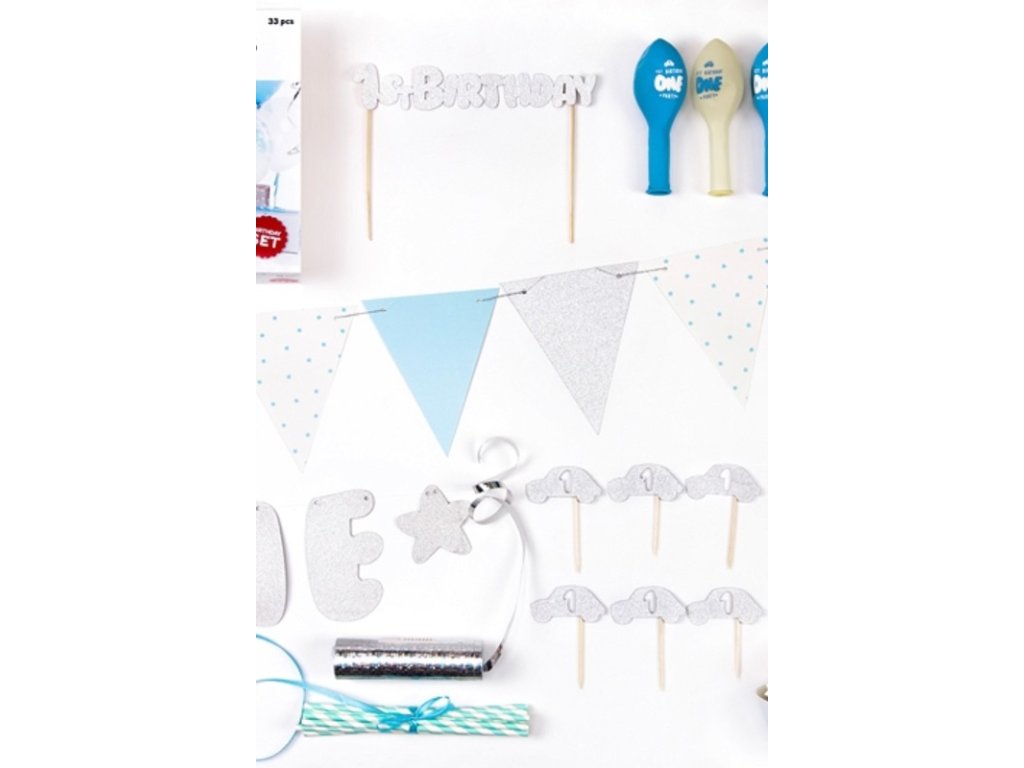 Obsahuje vlaječkovou girlandu, banner s nápisem "one", 6 košíčků na muffiny, 6 ks ozdobných zapichovátek, ozdobu na dort, 10 ks brček, 6 ks balónků s potiskem, stříbrnou serpentýnu a úzkou saténovou stužku.