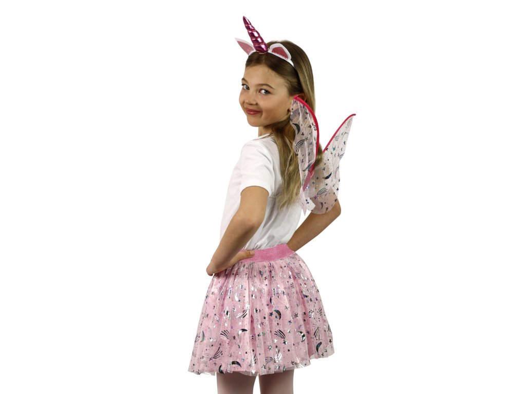 Nadýchaná sukýnka růžové barva je doplněna stříbrnou gumou v pase. Součástí této sady je senzační čelenka jednorožce a perfektně sladěná křídla.