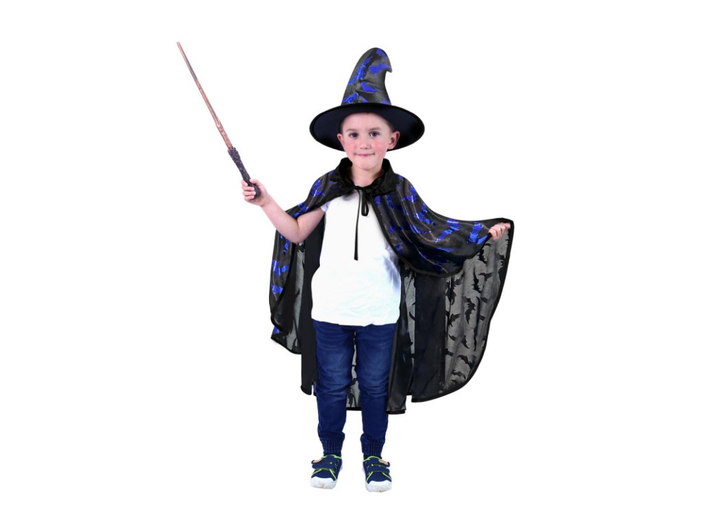 Balení obsahuje čarodějnický plášť černé barvy s potiskem netopýrů a perfektně sladěný klobouk.