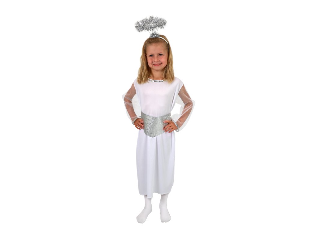 Půvabný karnevalový kostým s motivem anděla ve stříbrno-bílé barvě a velikosti S je určen pro holčičky ve věkovém rozmezí 6-8 let (117 -128 cm).