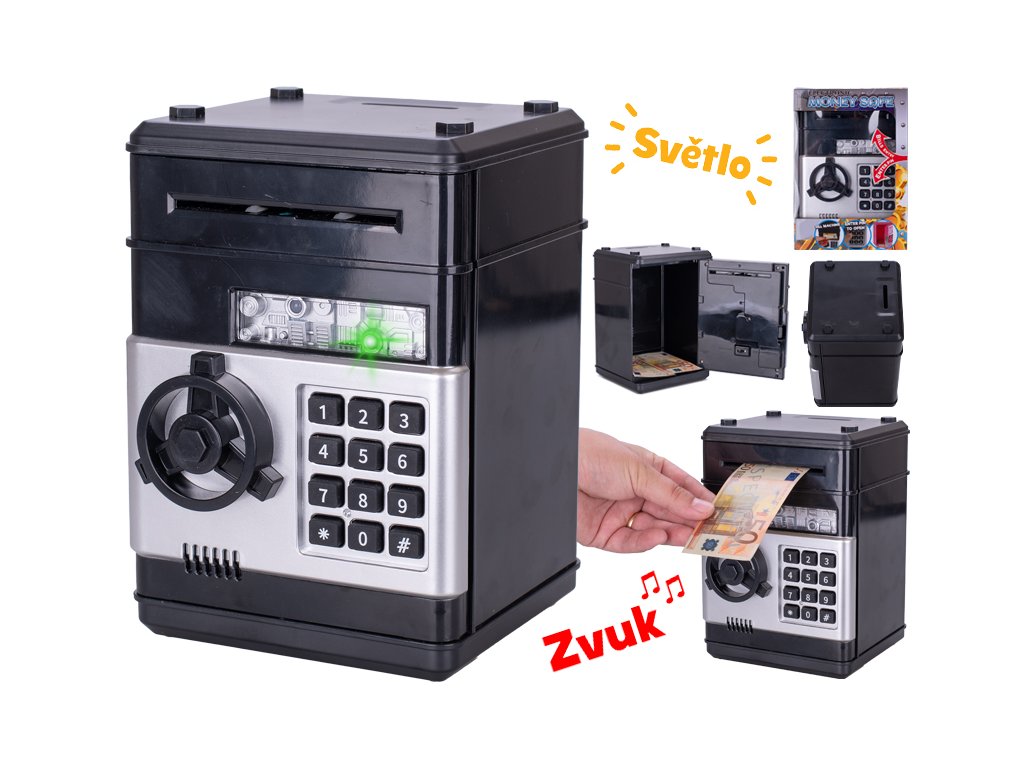 Trezor 19,5 cm černý s odemykáním na kód na baterie se světlem a zvukem s penězi v krabičce.