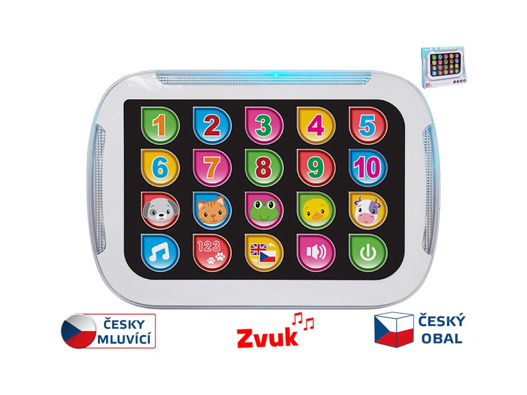 Tablet vzdělávací 19x13 cm na baterie česky a anglicky mluvící se světlem.