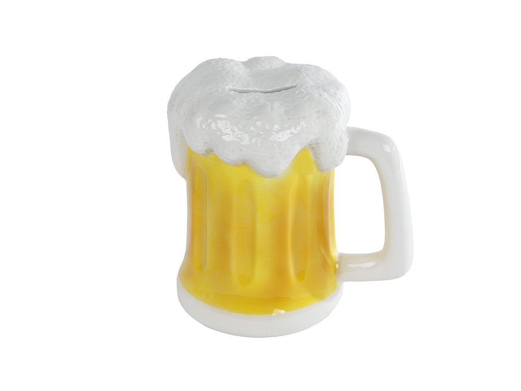 Porcelánová pokladnička jako pivní půllitr.