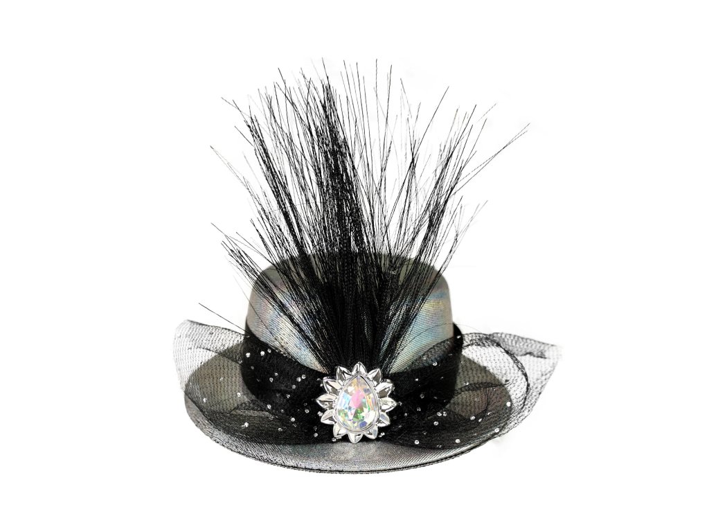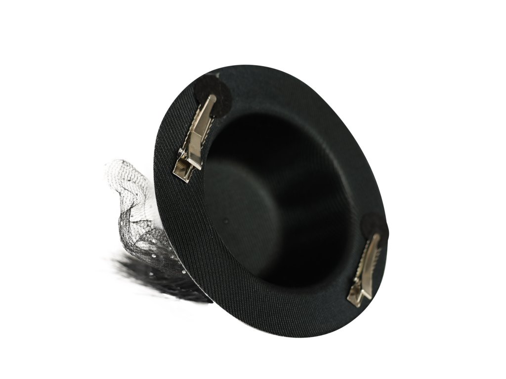 Mini klobouček stříbrné barvy s černou stuhou, peřím a tylem je doplněn šperkem.