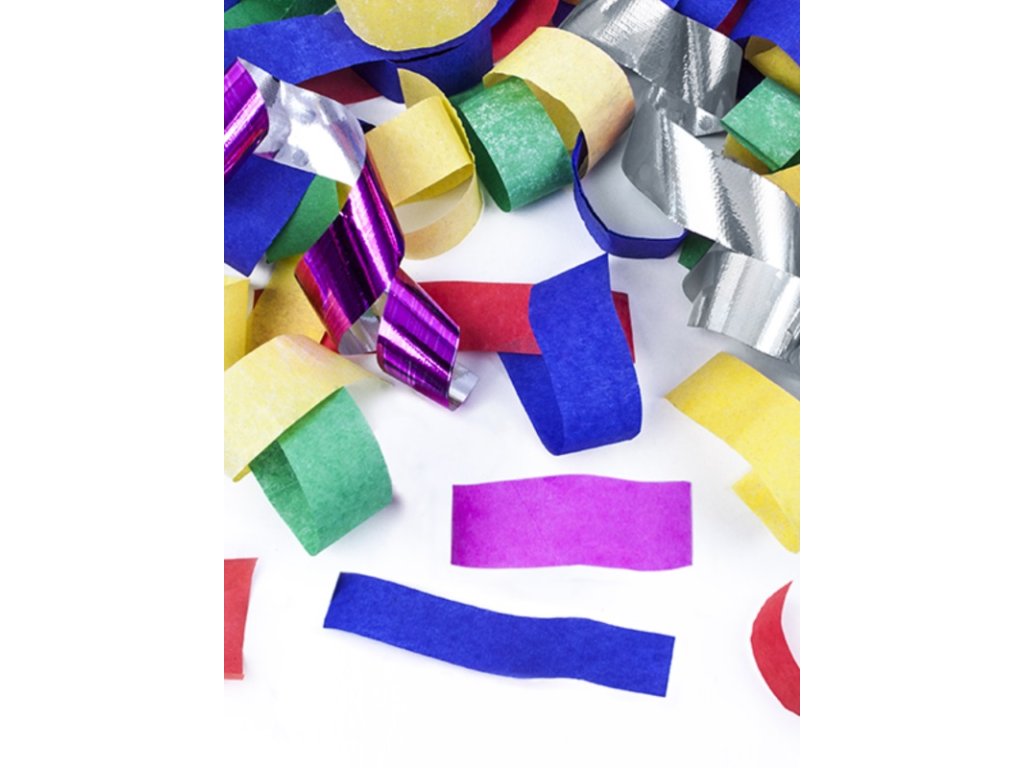 Konfetový kanón obsahuje barevné blýskavé papírky.