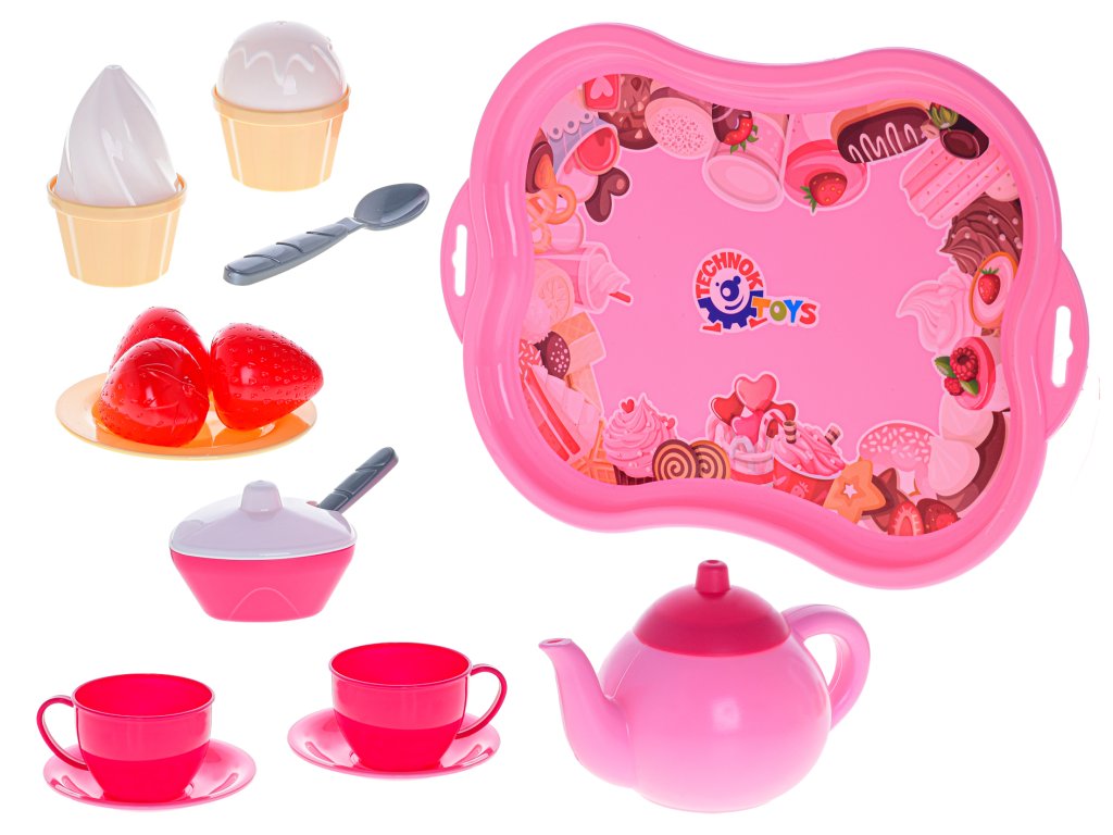 Růžovo-červený set s dezerty, podnosem a ovocem potěší každou malou hospodyňku.
