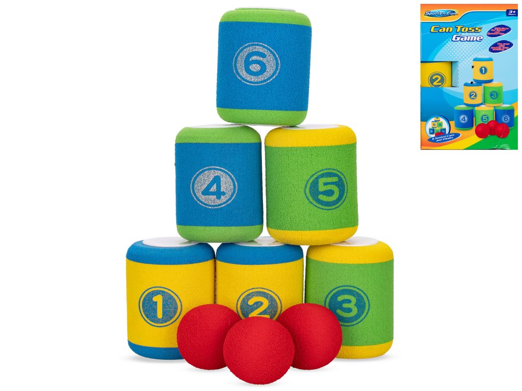 Házecí hra shoď plechovky 6 ks s míčkem 3 ks v krabičce.