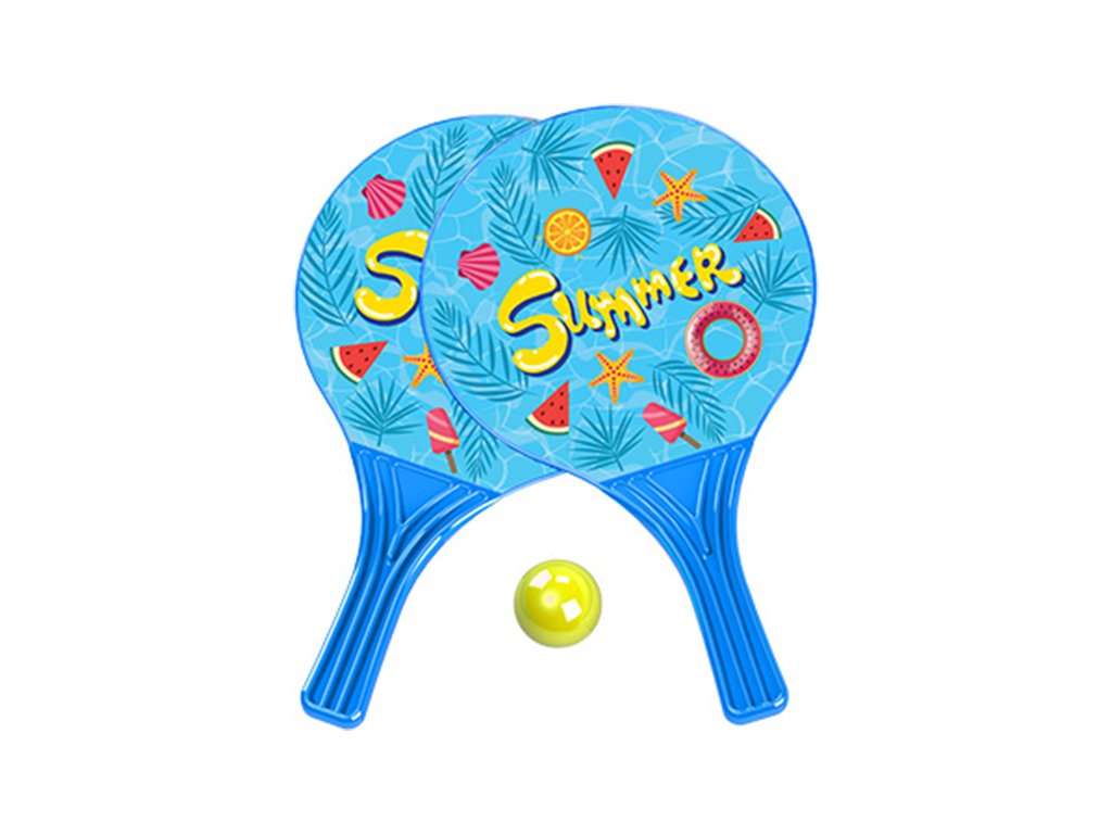Pálky plážové 37,5 cm modré 2 ks s míčkem 4 cm v síťce.
