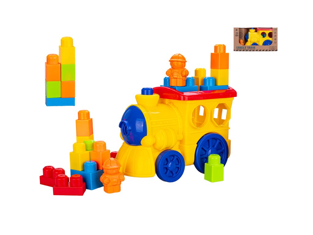Vláček 28 cm volný chod s kostkami 13 ks a postavičkou v krabičce