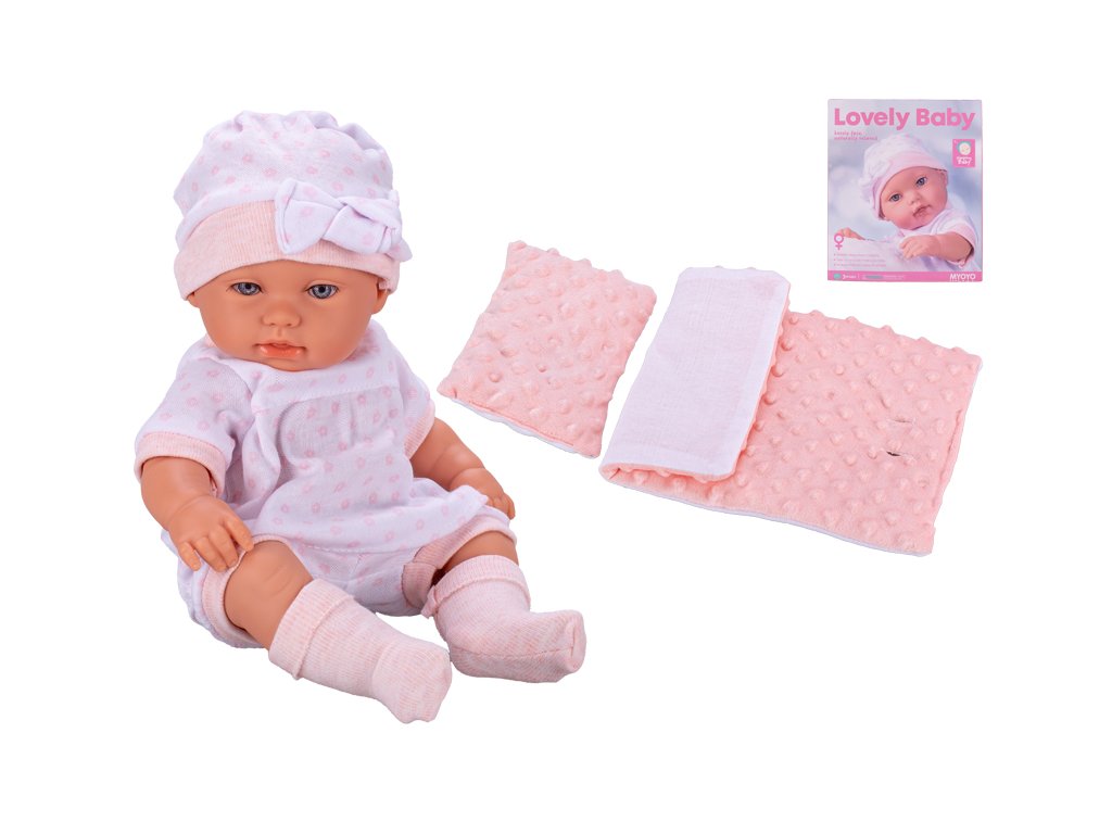 Miminko tvrdé tělo 33 cm růžové s peřinkami v krabičce.
