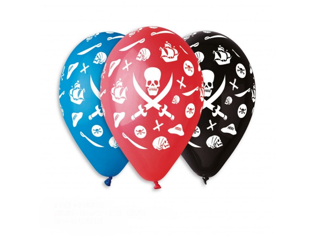 100 ks pastelových balónků v mixu černé, modré a červené barvy s potiskem pirátského motivu o průměru 30 cm.