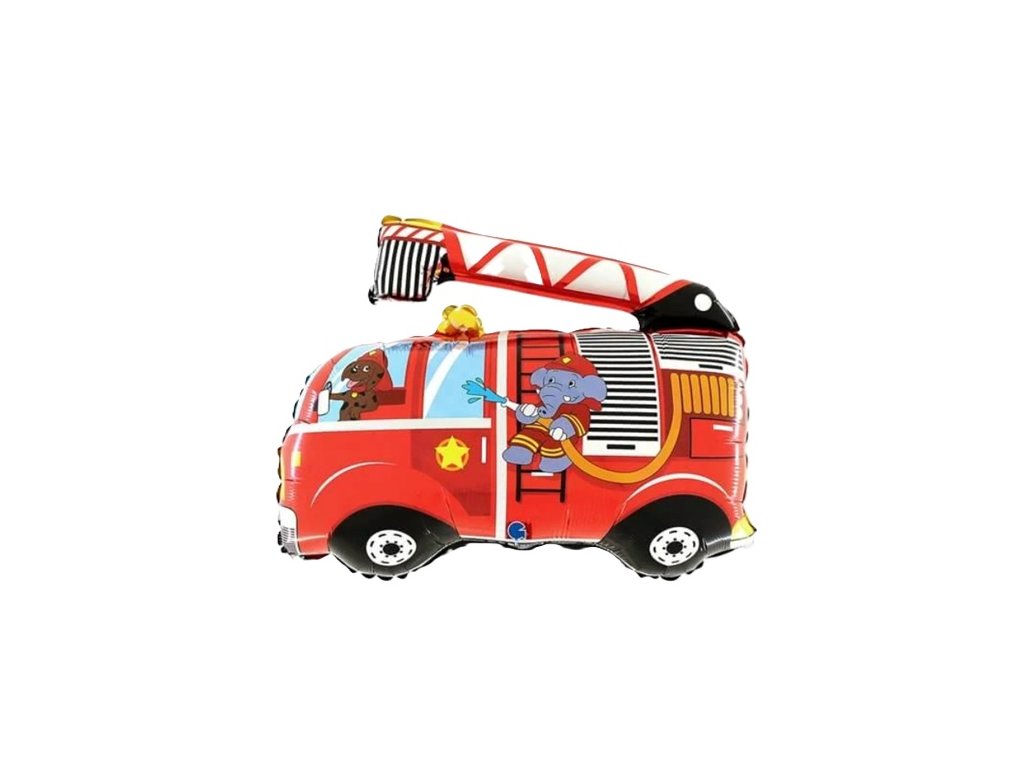 Fóliový balónek ve tvaru červeného hasičského auta se zvířátky jako hasiči.