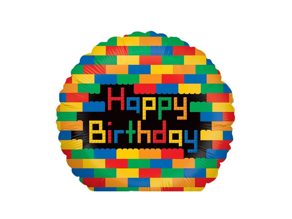 Foliový balónek ve tvaru kruhu s kostkami lega a nápisem Birthday.