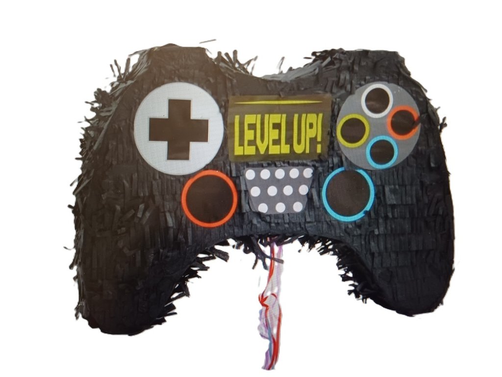 Piňata v motivu černého videoherního ovladače s nápisem Level Up je skvělou volbou na narozeninovou oslavu, piňatu stačí naplnit sladkostmi, zavěsit a pak už si pouze užít srandu, která při snaze trefit ji bude.