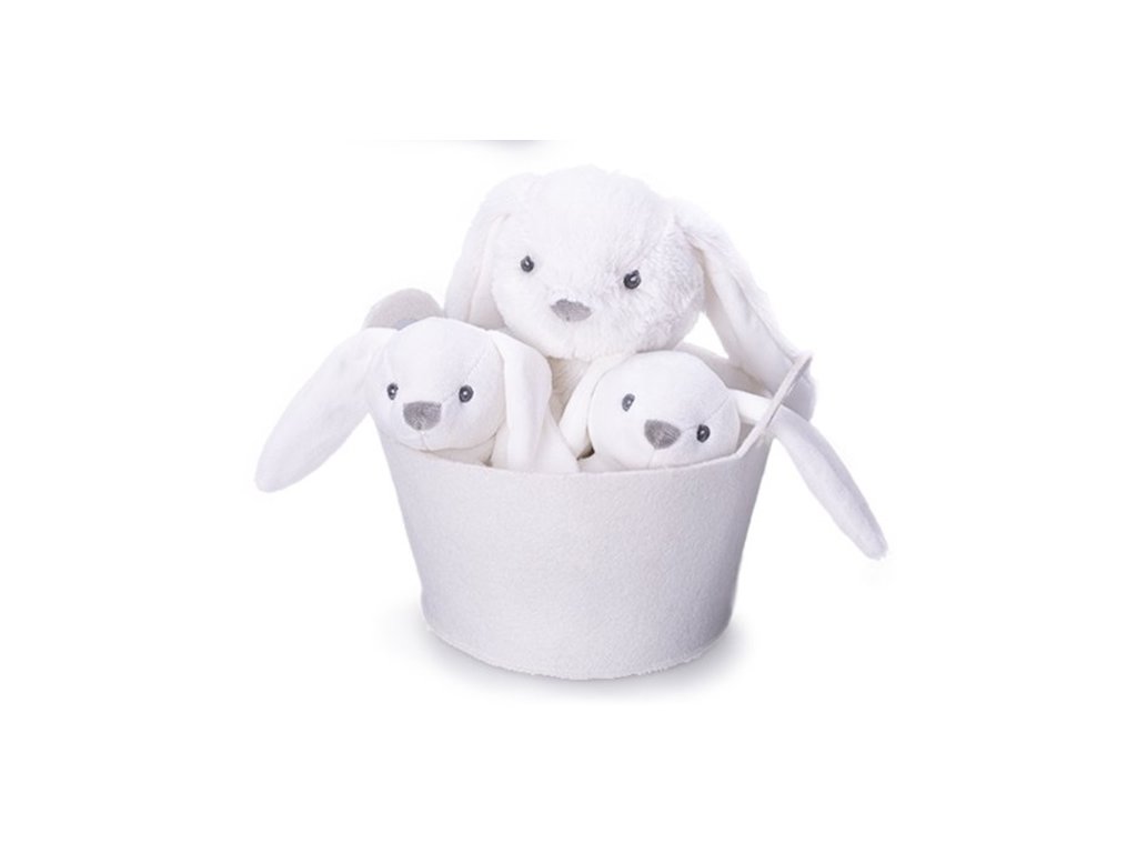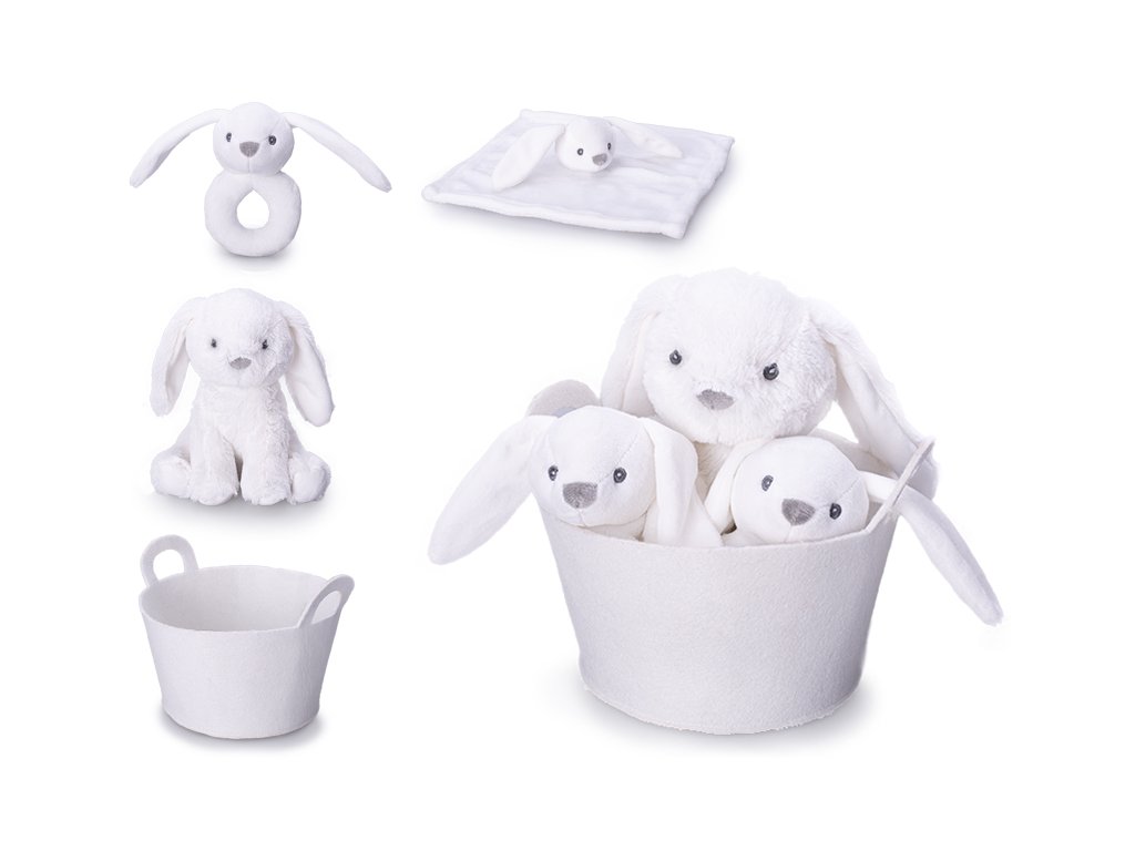 Zajíček plyšový 20 cm bílý sedící s chrastítkem 13 cm a kamarád na spinkání v košíku.