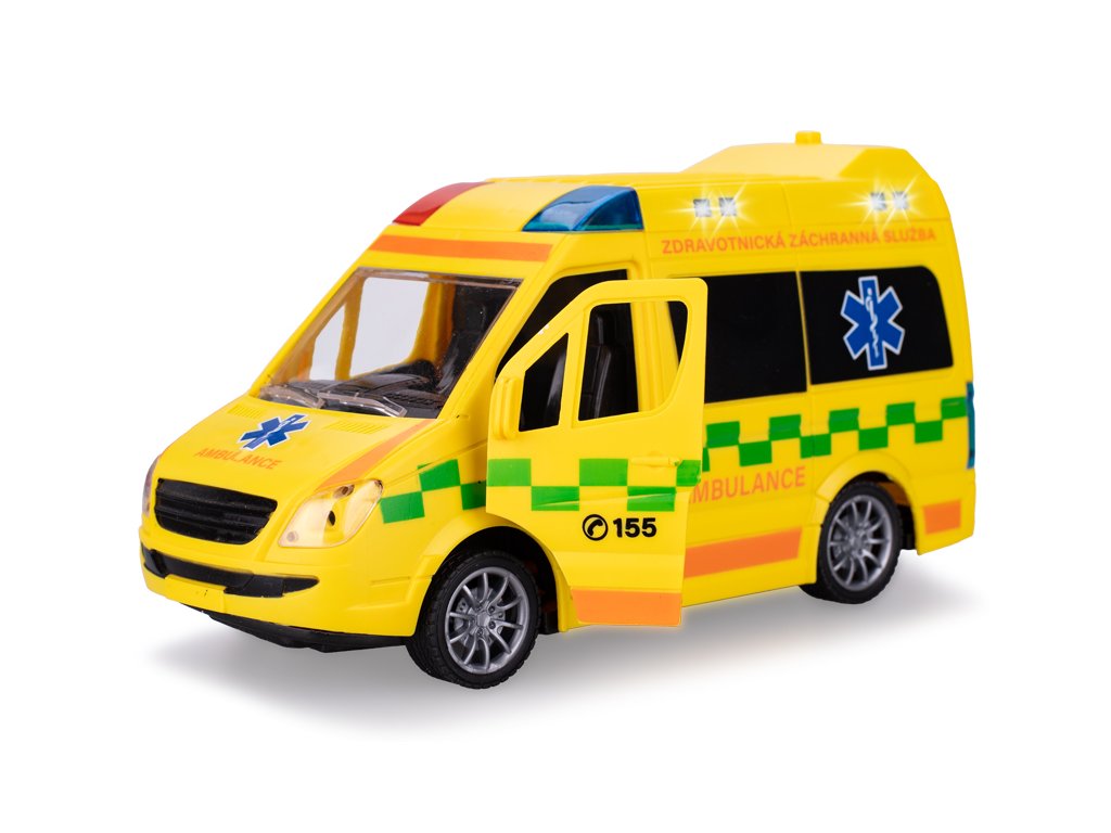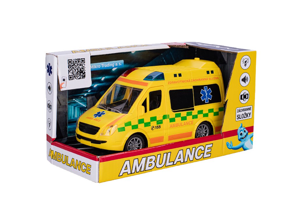 Auto ambulance CZ 21,5 cm 1:20 na setrvačník na baterie se světlem a zvukem v krabičce.