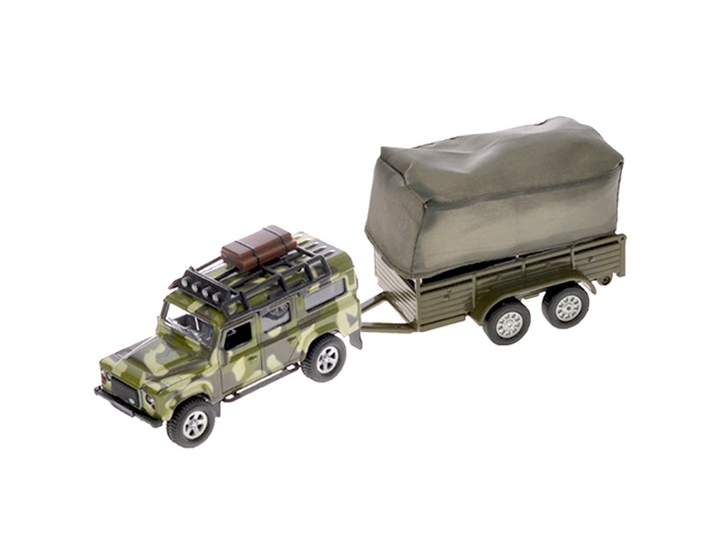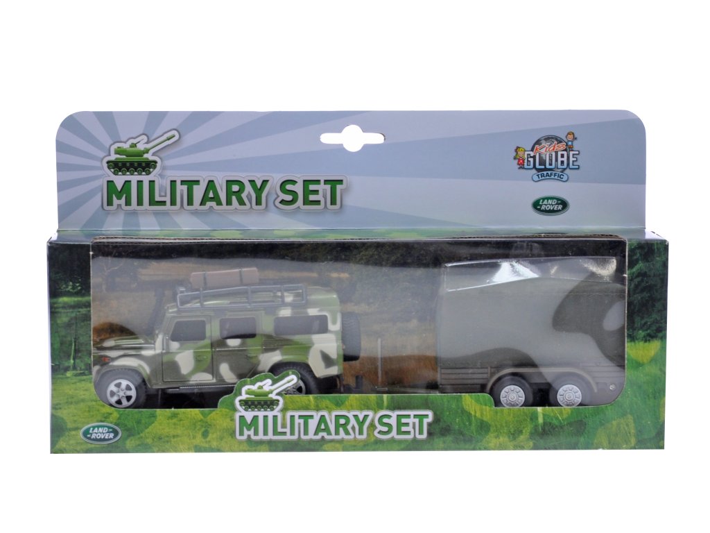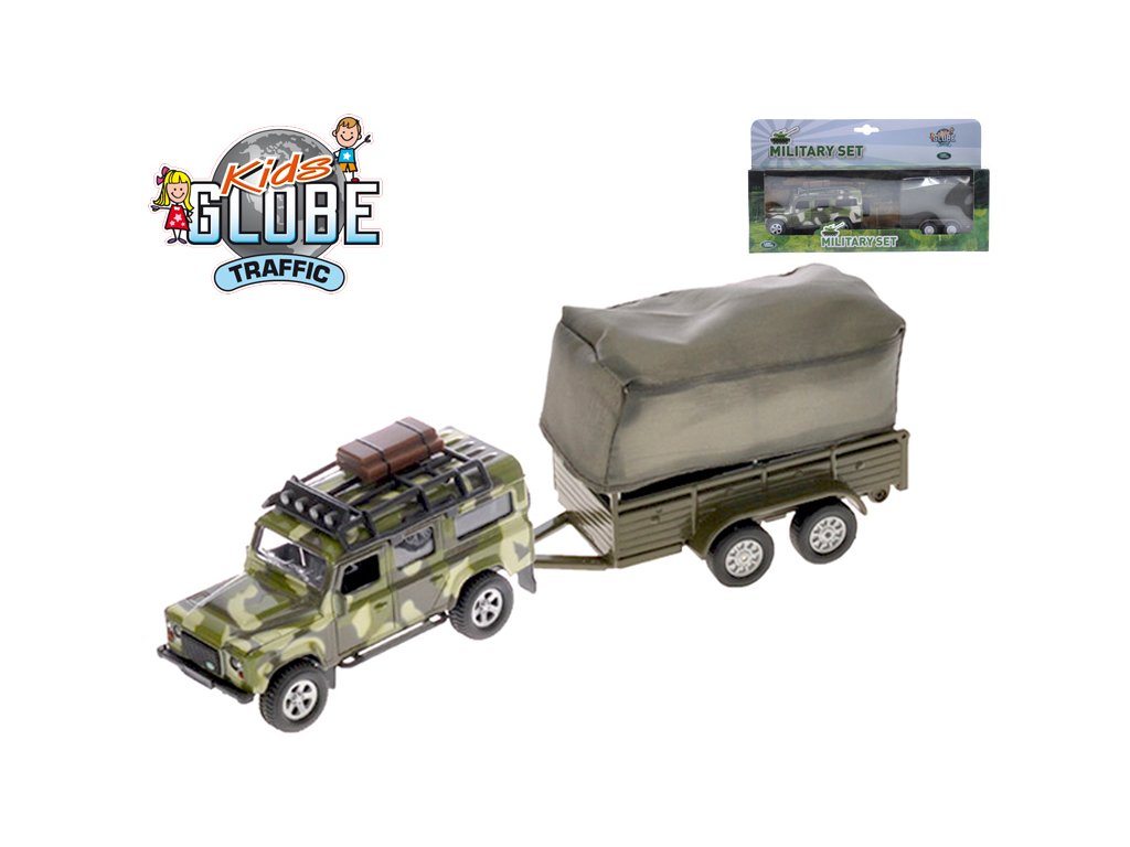 Kids Globe Traffic Land Rover Defender Military 14,5 cm kov zpětný chod s přívěsem v krabičce