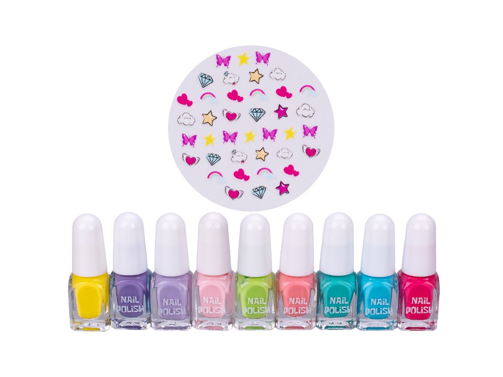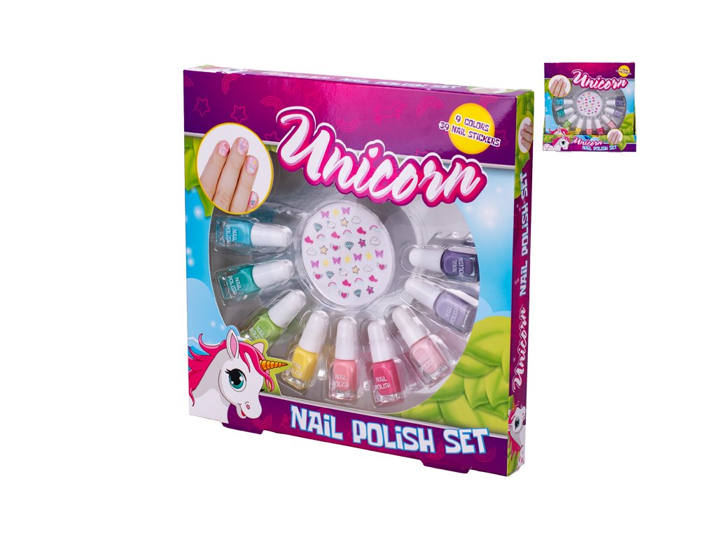 Unicorn sada laků na nehty 2,1 ml 9 ks a nálepek na nehty v krabičce.