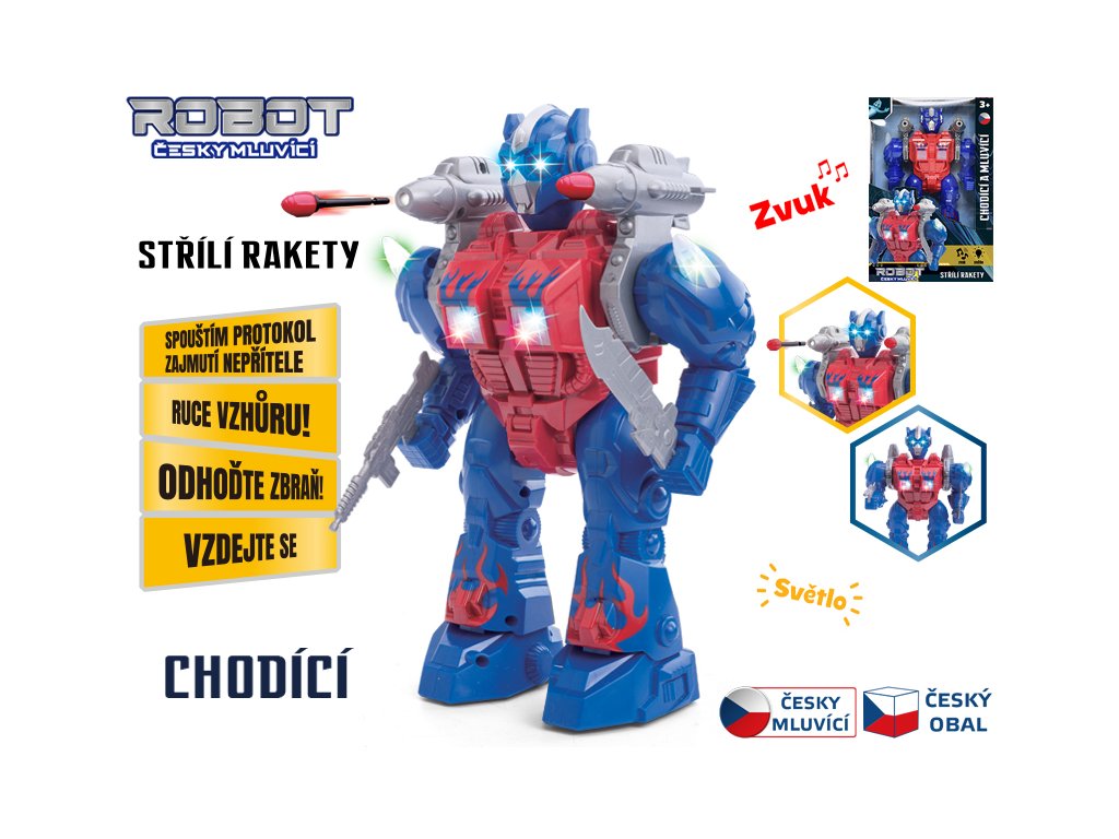 Robot 23 cm na baterie česky mluvící chodící s doplňky, světlem a zvukem v krabičce.