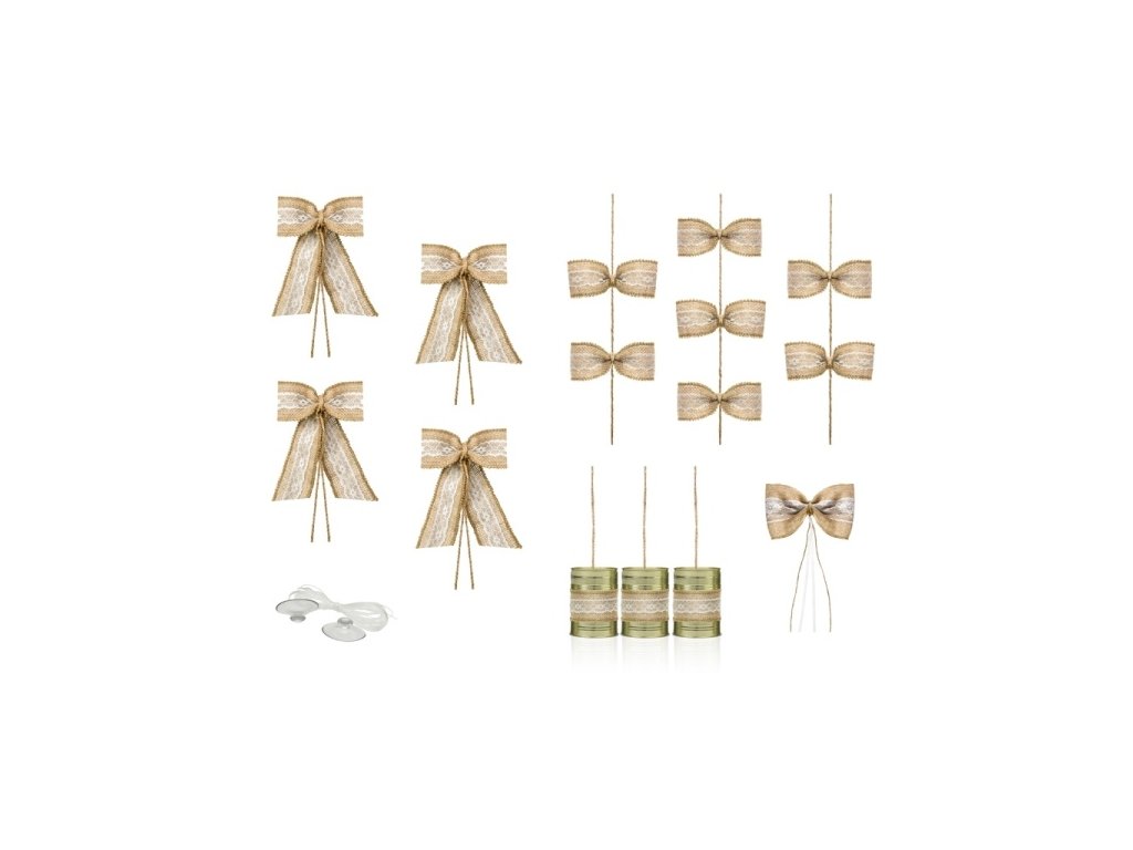 Souprava obsahuje: 1 dlouhé lanko, které se ozdobí jutovými mašličkami, dlouhý provázek z juty se třemi zlatými plechovkami, čtyři mašličky na otevírání dveří automobilu 13,5 cm x 18 cm a 6 přísavek na lanko