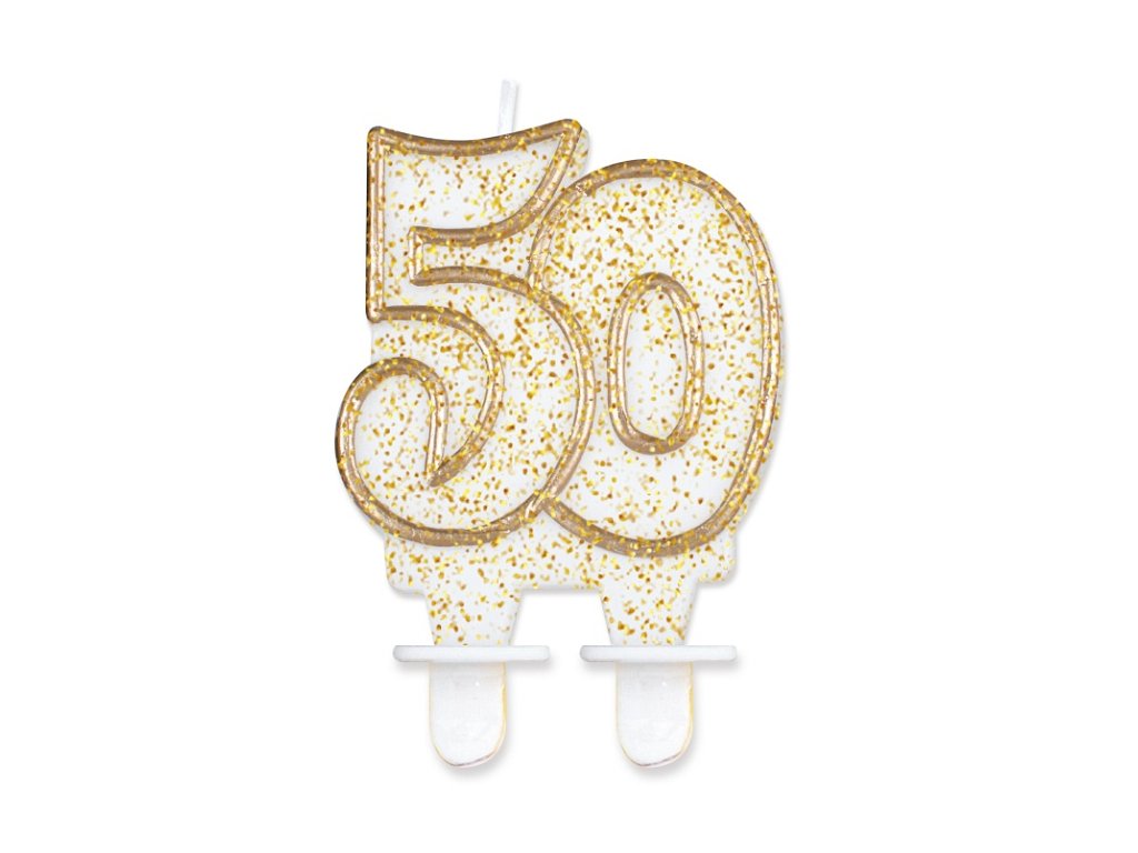Svíčka ve tvaru číslice 50 ve zlaté barvě se zlatými třpytkami.