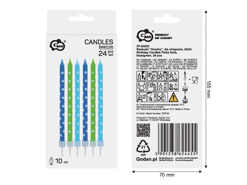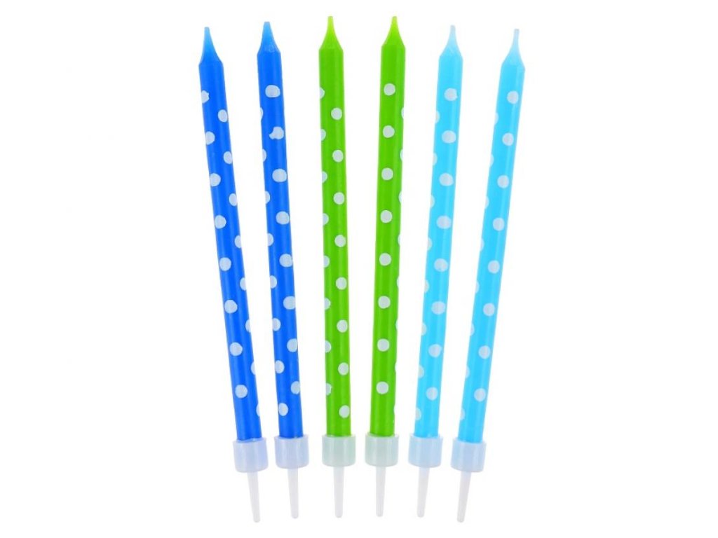 Sada 24 ks svíček v chlapeckých barvách s puntíky, všechny svíčky jsou na podstavcích.