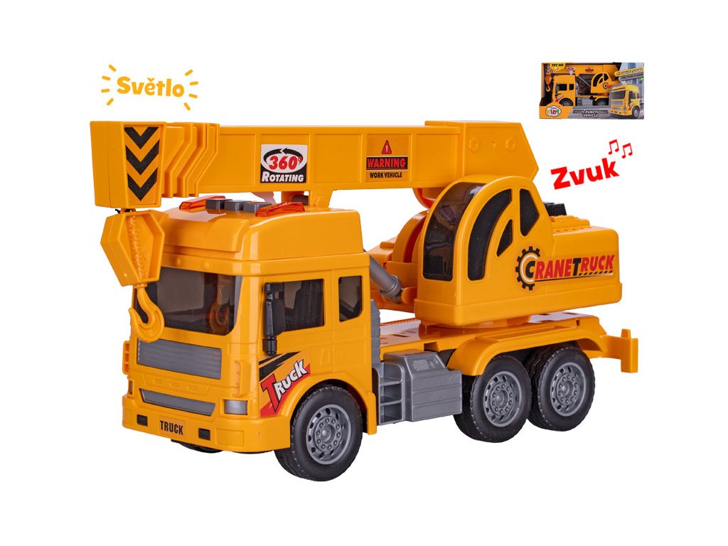 Auto stavební jeřáb 27 cm na setrvačník na baterie se světlem a zvukem v krabičce