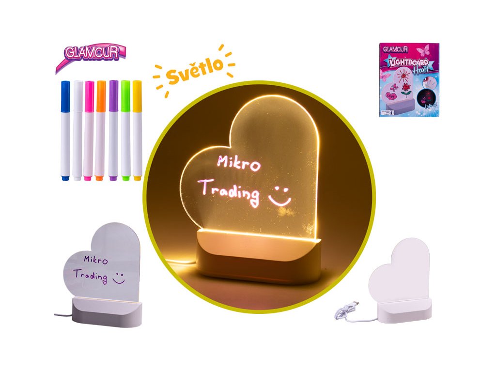 Glamour tabulka ve tvaru srdce 16 cm na USB svítící s fixami 7 ks v krabičce.