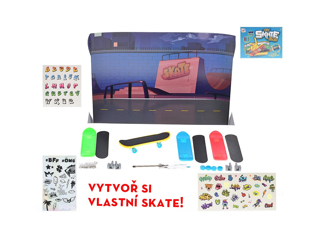 Sada slož a ozdob si skateboard 9,5 cm 4 ks s doplňky v krabičce.