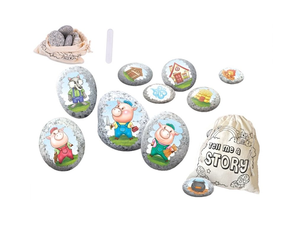 Tři malá prasátka pohádková sada kamínků se samolepkou 10 ks v krabičce.