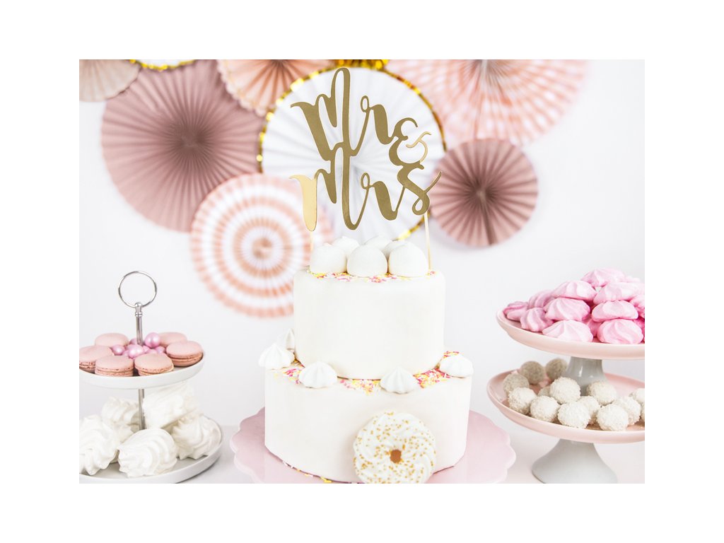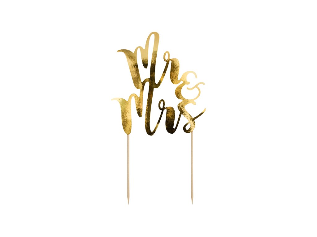 Ozdoba na dort v lesklé zlaté barvě - nápis Mr&Mrs, výška ozdoby je asi 25,5 cm.